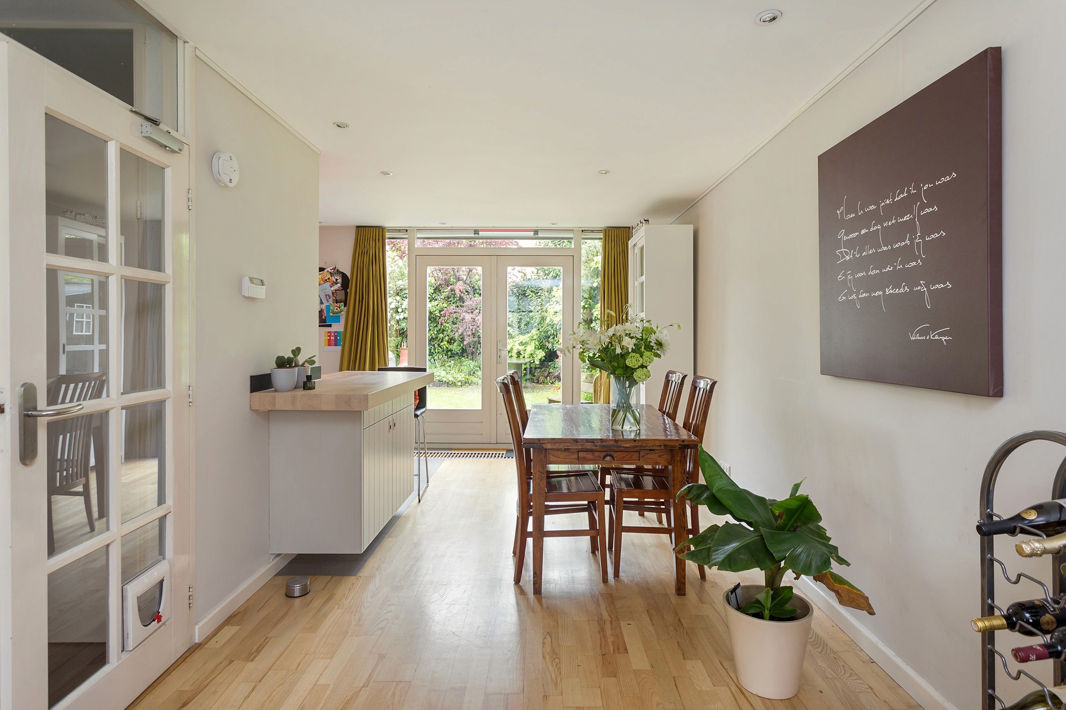 De lichte woonkamer is afgewerkt met een prachtige houten parketvloer en beschikt over een sfeervolle open haard. Via openslaande deuren loopt u direct de zonnige achtertuin in. Deze fijne leefruimte biedt volop mogelijkheden voor ontspanning, werken en gezelligheid.